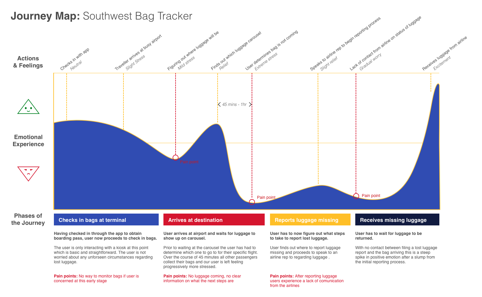 After our first round of interviews, we regrouped as a team and created an affinity map to identify recurring patterns and themes based on our users’ responses. Users cited the growing anxiety one feels at the carousel as other passengers begin leaving with their things. Many users felt there was not enough proactive communication from the airline regarding their luggage and more could have been done on the backend to keep them informed after luggage is delayed. After identifying specific pain points, we began developing personas, problem statements, and a User Journey Map.