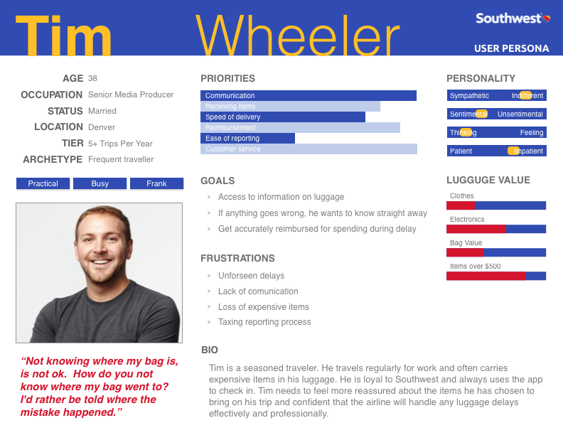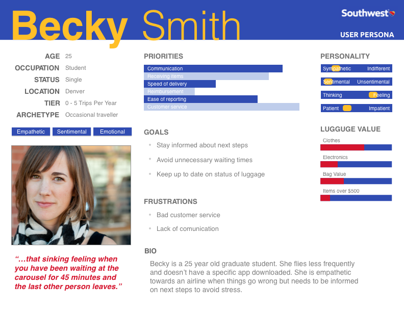 As a team of 3 UXers, our task was to bring those costs down and keep the LUV high by readdressing the lost luggage experience. Our solution focused on the users needs before, during, and after a bag is lost.