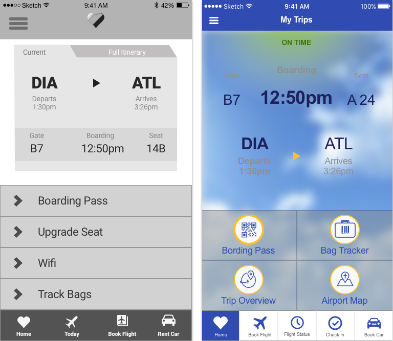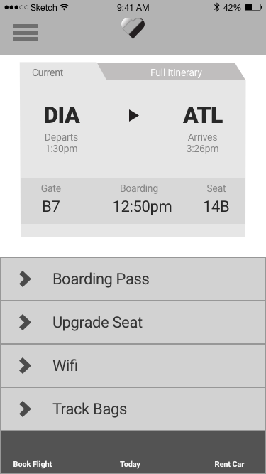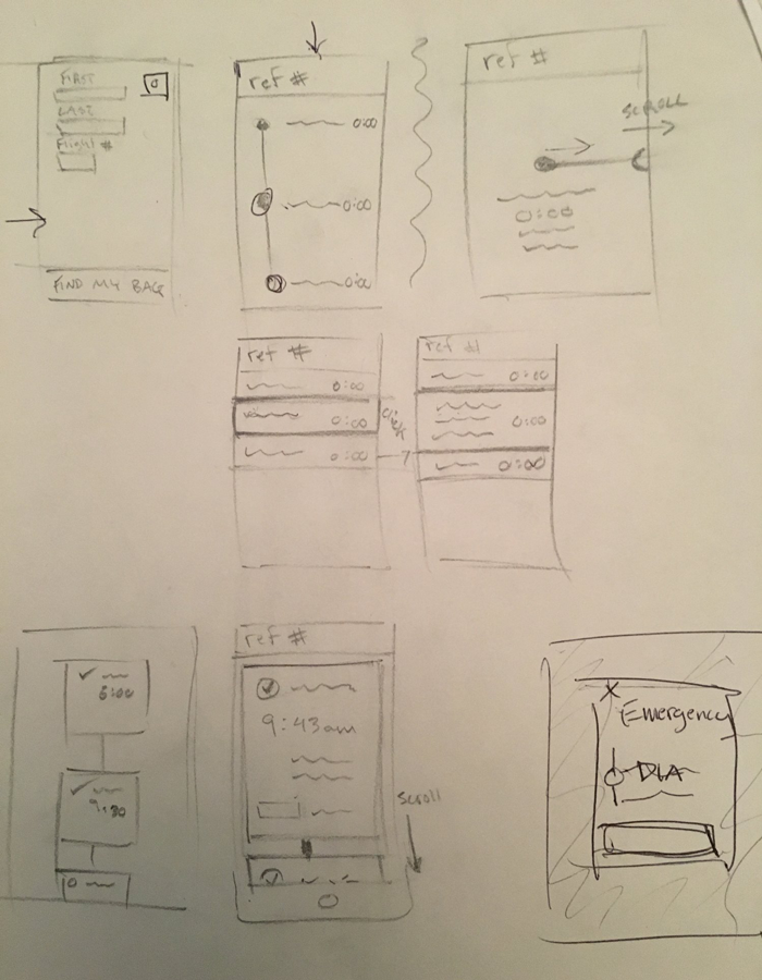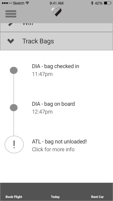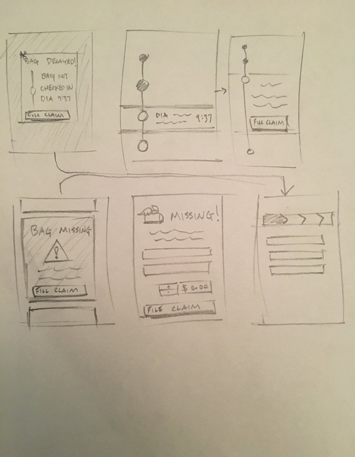 We tested our initial wireframes and made several key improvements to our design. We used a combination of an online user testing platform, guerilla user testing, and scheduled in-person tests. Users were given two different scenarios for the test. The first was to be under the assumption they had checked in via the app and were tasked to track their bags in the app because they were worried about their connecting flight in Atlanta. The second was to negotiate a 'baggage alert' notification and the following reporting process. The insights we pulled from these tests informed our design decisions for the second iteration.