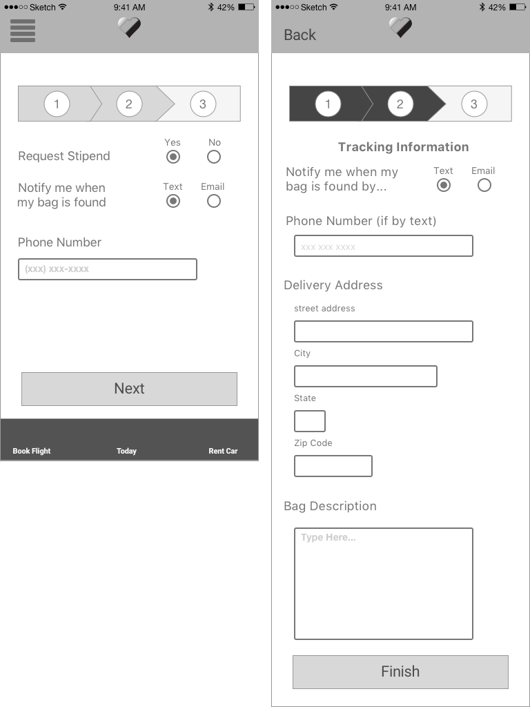 We found that participants gave us good feedback on what kind of information they would expect to be collected as they went through the reporting process. We had a participant mention that if they were traveling they would want to know that they could give a delivery address for the luggage through this reporting process. Our design change here addresses that concern.