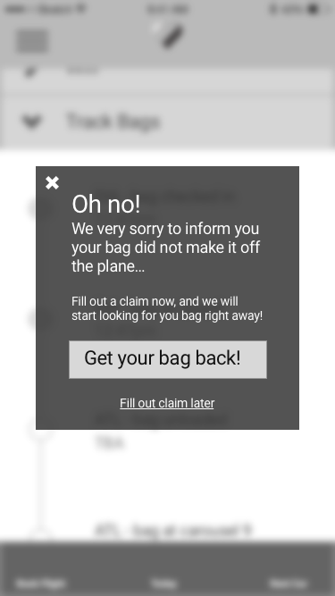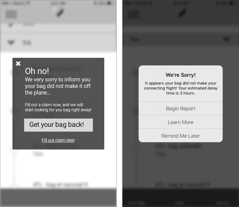 Users voiced concern about the tone of our initial alert message. "Oh no!" did not seem like a thoughtful, caring response. Additionally, the icon for the alert was too alarming and conjured up mixed notions on the intent of the notification. Given that this experience would be a particularly stressful experience multiple participants mentioned they would want this alert message to be more reassuring and professional. Secondly the call to action drew questions like "Wouldn't they already be looking for my bag...?" We decided make the modal fit the familiar iOS HIG guidelines, as well as providing an option allowing users to see how the process works before jumping into it.