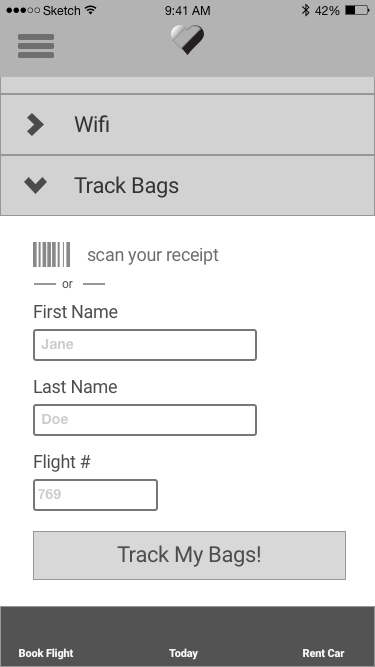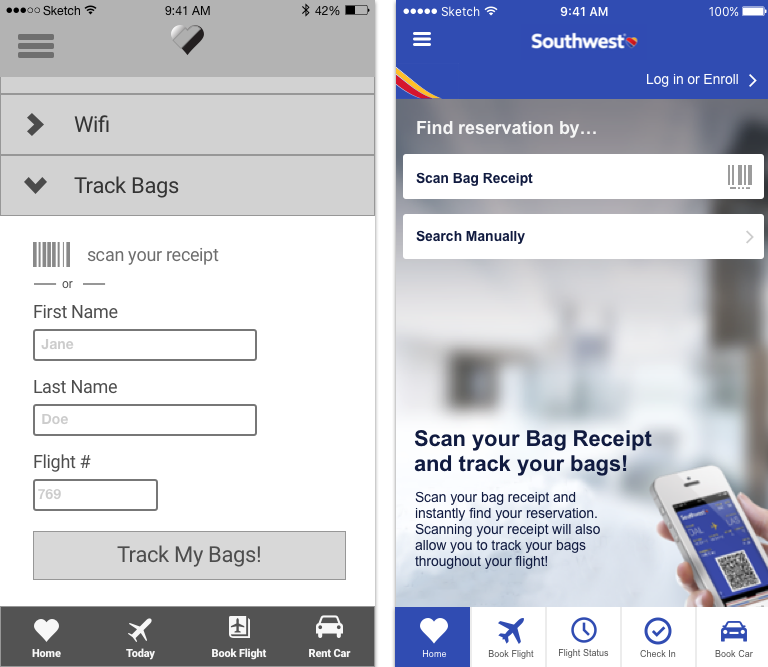 In this iteration we went back to using Southwest's original home screen with slight modifications. Now when the app is opened users are prompted to scan their receipt, automatically finding their reservation information and bag-tracking information.