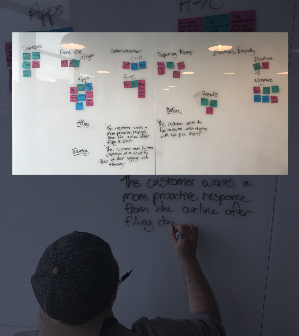 The next step was to conduct in person or over the phone interviews with anyone who had experienced a loss or delay of luggage. These interviews helped us understand the motivations, goals and pain points of users throughout the experience, which helped to ground us in the users perspective.