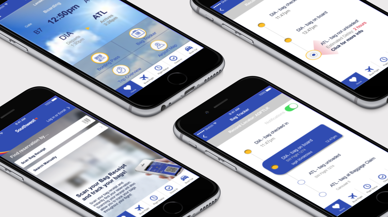 Our initial solution focused on the problems at each stage of the user journey timeline. We wanted anxious passengers to feel reassured from the moment they check in by emphasizing Southwest's customer-driven branding. Second, we wanted passengers to have the option to track their bags and receive real time notifications on the status of their bag throughout the flight. Finally, if anything were to go wrong, a notification would be sent to the passengers, and they would have access to the 'delayed luggage' form through the app, as well as continued bag tracking during the retrieval process.